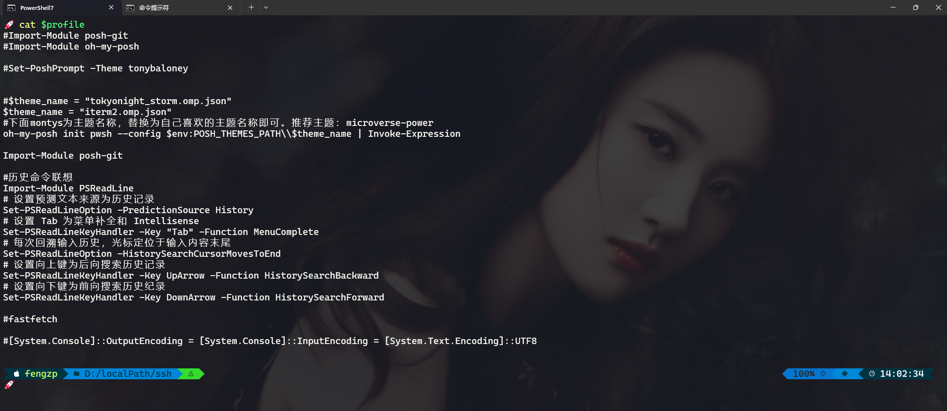 windows-terminalWindows现代化的终端管理器,可设置背景图片,字体等。可配置多个终端,如已安装可省略,不是必须的。pwsh windows跨平台的命令行工具,Powershell core。oh-my-poshpowershell美化插件(module),包含多种主题posh-gitpowershell git美化插件(module)。